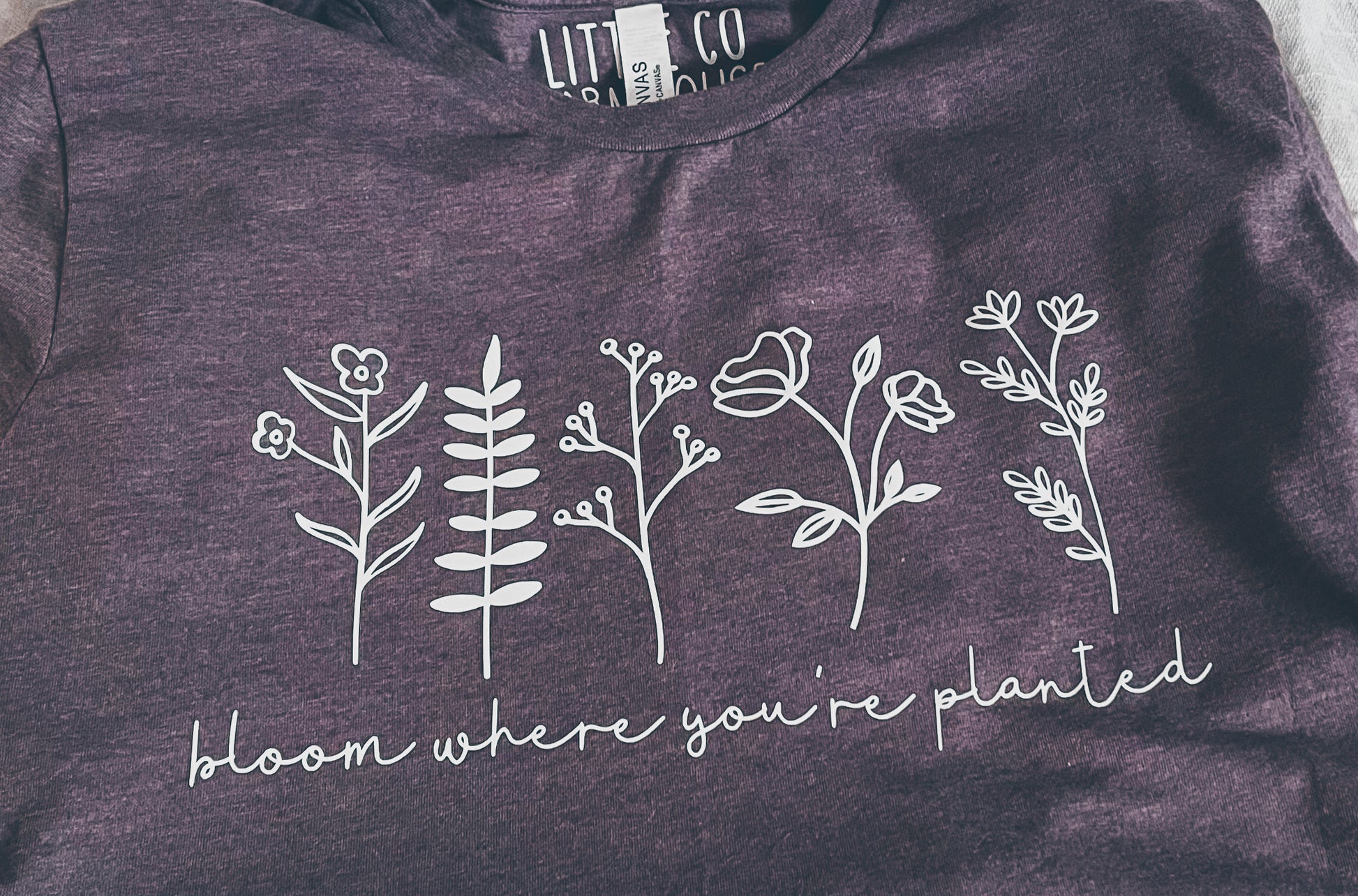 Bloom where you're planted tee available in heather purple. Bella + Canvas tee. Relaxed fit, true to size.