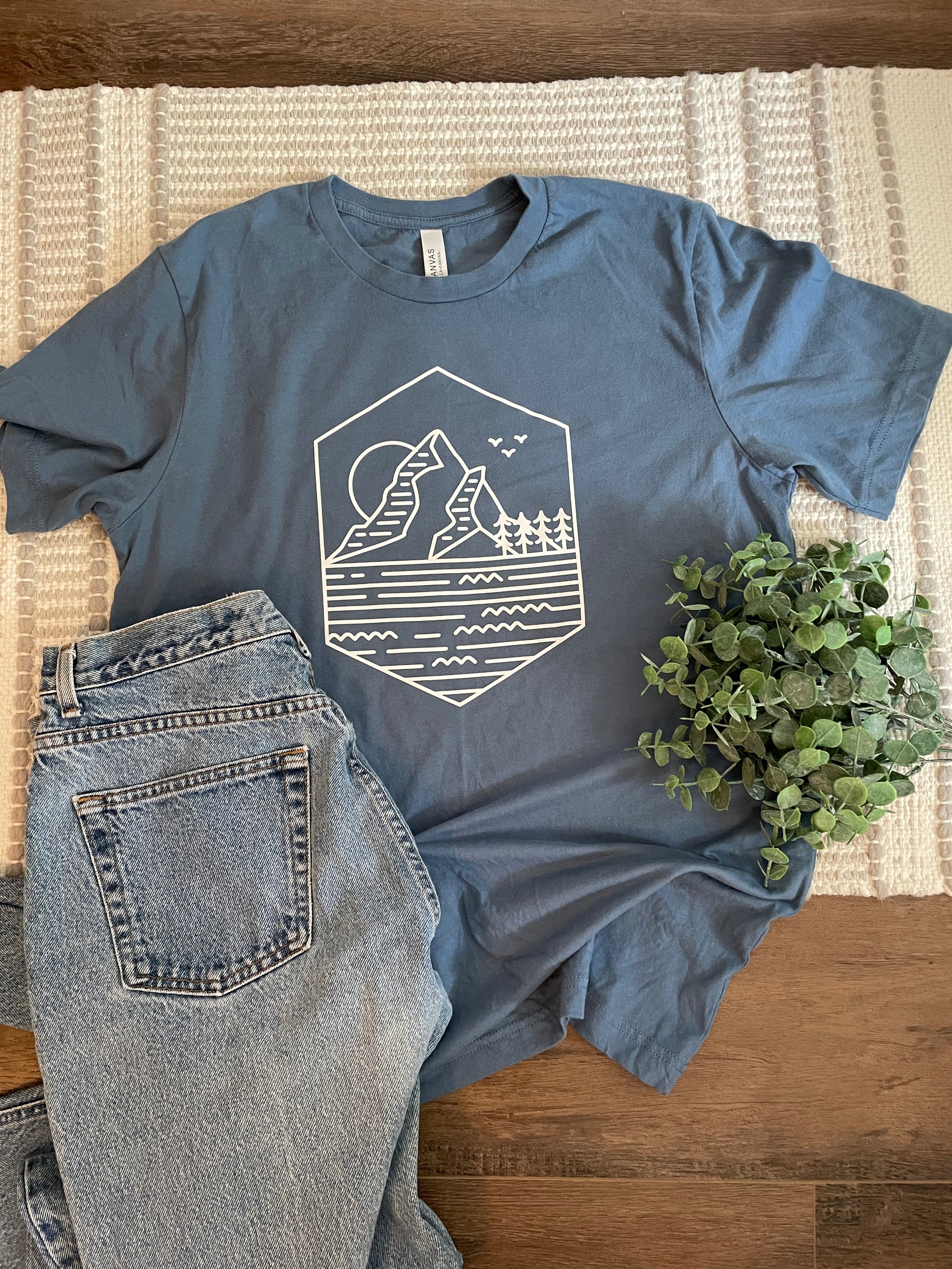 In slate blue, this casual tee is perfect for the adventure lovers. Bella + Canvas tee, relaxed fit, true to size.